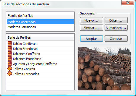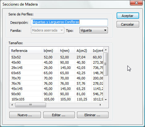 Base de datos utilizada para almacenar las distintas familias de perfiles de madera con sus respectivos tamaños. Cuando tenga que especificar el perfil de una barra de madera dibujada en el modelo, habrá de seleccionar uno de los disponibles en esta base de datos.